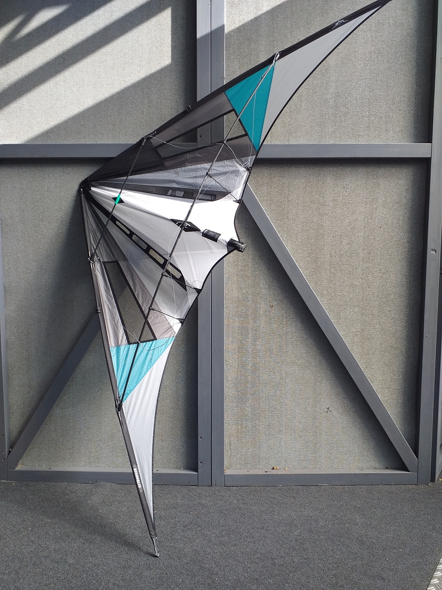 Spannweite 232cm , Segel Ghost, Gerüst Skyshark/CFK 5mm, professionelle Verbindungstechnik, integrierte Gewichtstasche am Kiel, Monofilmverstärkung/Stand-offs. Jojoshields an der oberen Querspreize, Jojostopper.