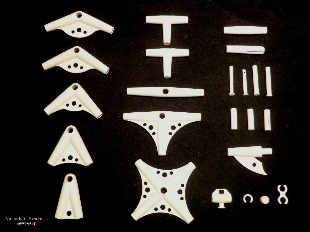 Das neue Vario Kite System eröffnet dem Drachenkonstrukteur nahezu unerschöpfliche Verbindungsmöglichkeiten! Es beinhaltet Kunststoffverbinder in diversen Winkelausführungen, Kreuz –und T-Verbindungen mit selbstklemmenden, leicht konischen Bohrungsaufnahmen, die alle mit diagonalen Verbindern oder 3D-Abgängen kombiniert werden können. Zusätzlich erhältlich sind verschiedene sinnvolle Ergänzungen wie Clips, Poller, Rohrverstärkungen mit Gummileinenbohrung, Reduzierungen auf kleine Durchmesser, Dübel für Verschraubungen, etc… Das System ist auf Verwendung von GFK oder CFK 10mm Stäben ausgelegt, wobei die Reduzierungshülsen auch kleinere Durchmesser wie 8mm, 6mm und 4mm erlauben. Die Verbinder sind aus hochwertigem, mit Glasfaser verstärktem Kunststoff, dadurch sehr langlebig, immer wieder verwendbar und robust.